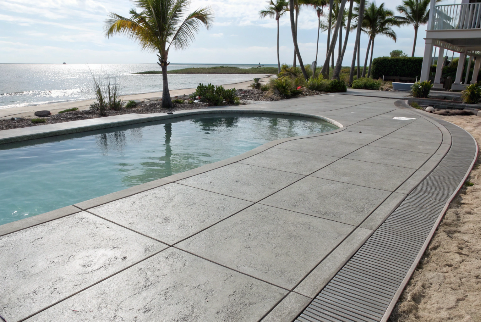 - Decorative pool surrounds using slip-resistant, heat-reflective finishes